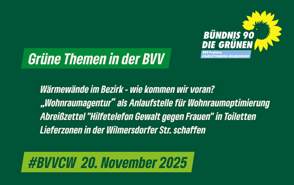 Die Ausschüsse der Bezirksverordnetenversammlung Charlottenburg-Wilmersdorf (BVV) wurden konstituiert. Dazu informiert die Fraktion BÜNDNIS 90/DIE GRÜNEN über ihre Vertreter*innen in den neuen Ausschüssen.